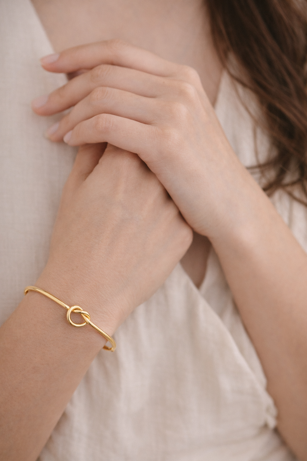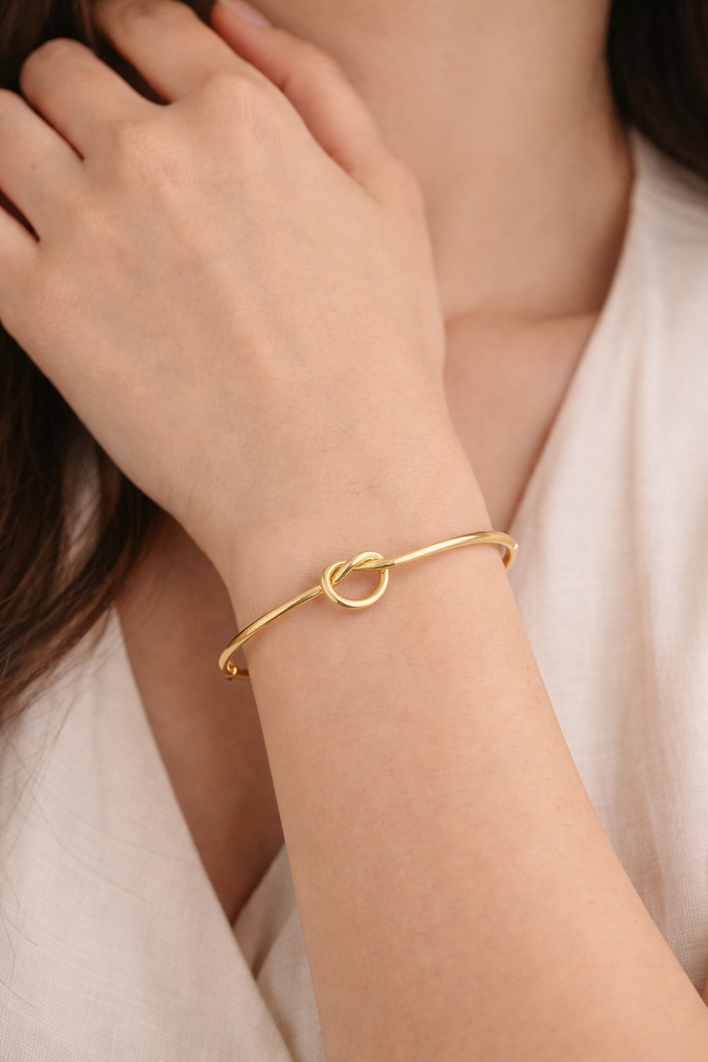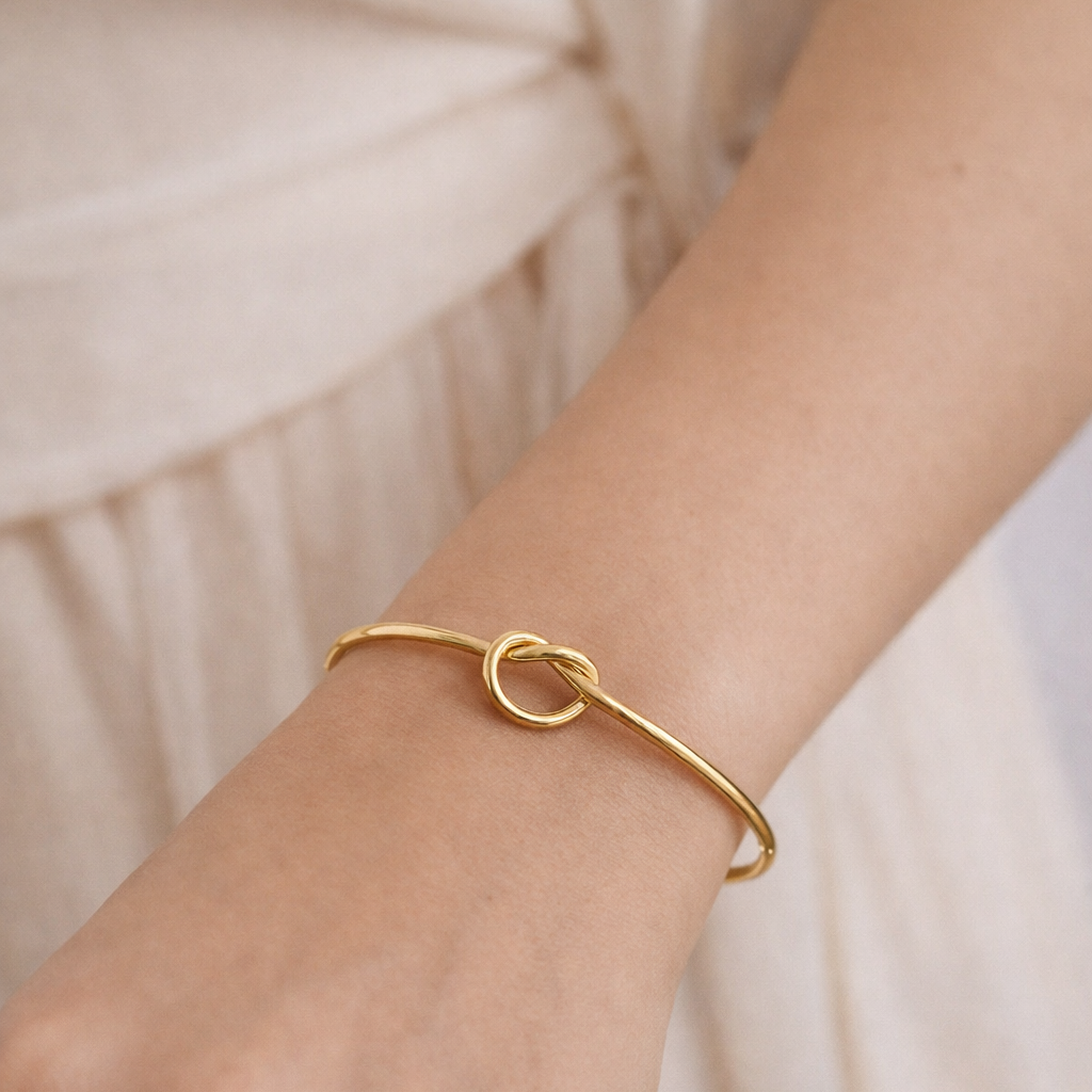 Centralnym elementem jest finezyjny splot przypominający symbol nieskończoności – znak trwałości, więzi i harmonii. Lekka, otwarta forma sprawia, że bransoletka doskonale dopasowuje się do nadgarstka, zapewniając komfort noszenia przez cały dzień.